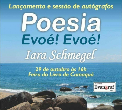 A escritora e poetisa Iara Schmegel estará lançando seu mais novo livro durante a 37ª Feira do Livro de Camaquã que ocorre na Praça Cel. Sylvio Luiz, em frente ao Cine Teatro Coliseu, entre os dias 26 e 29 de outubro.