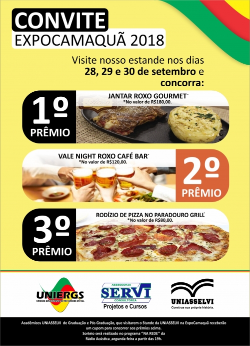 Acadêmicos UNIASSELVI de Graduação e Pós Graduação, que visitarem o Stande da UNIASSELVI na ExpoCamaquã receberão um cupom para concorrer aos prêmios. Sorteio será realizado no programa ‘’NA REDE’’ da Rádio Acústica, segunda-feira a partir das 19h.